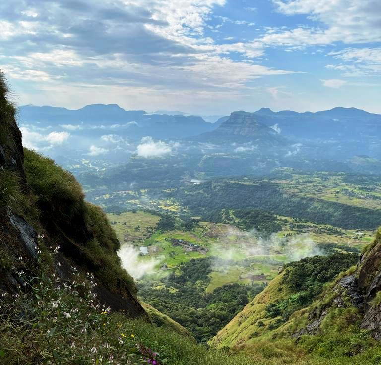 06:00 AM – Begin the trek! 🌿 Walk through misty trails, colorful flowers blooming after the monsoon, and clouds drifting around the Sahyadris.